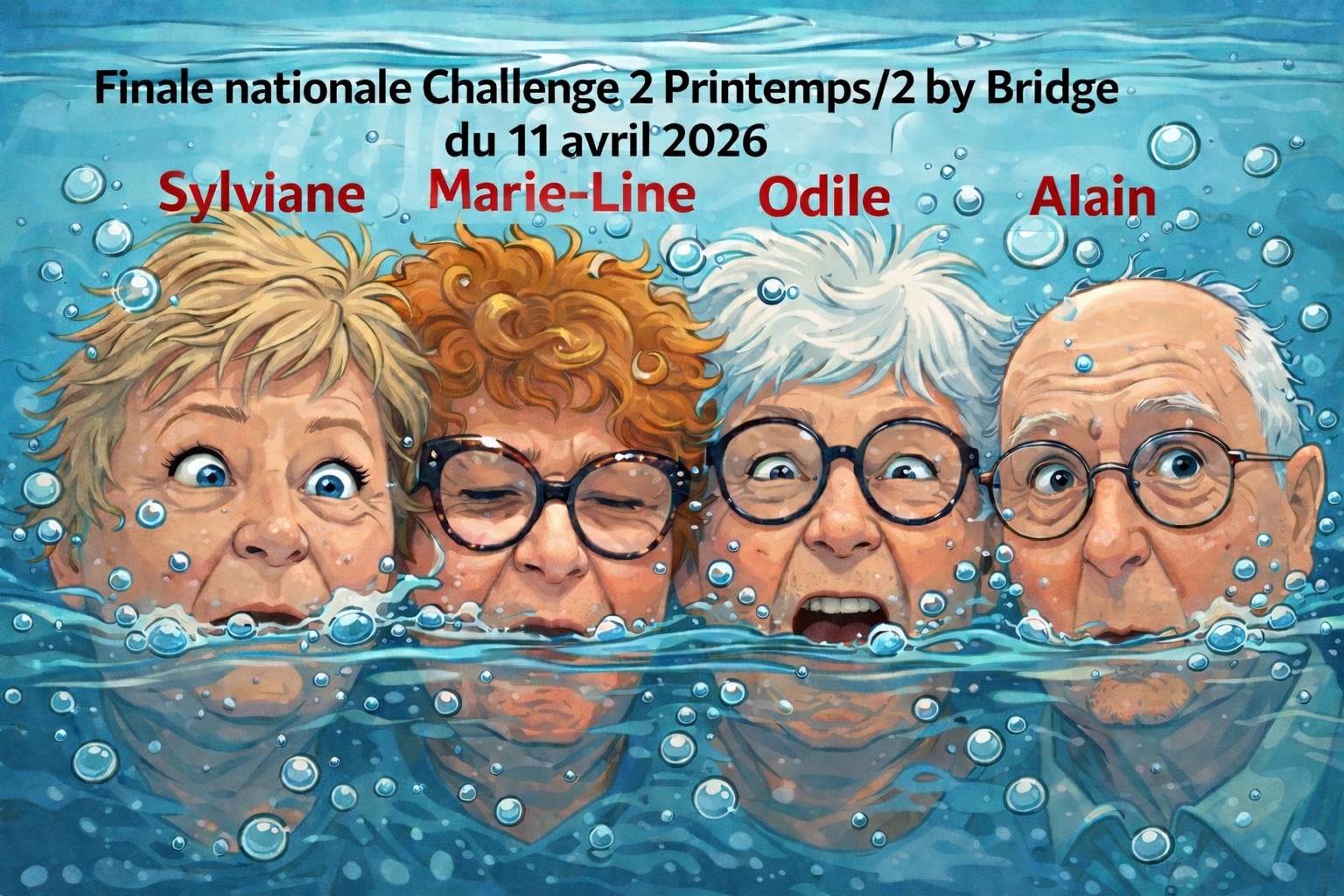 Samedi 11 avril 2026 à Mont Saint-Aignan, noyés dans le millier de participants à la finale NATIONALE du simultané, baptisé pompeusement Challenge 2 Printemps /2 by Bridge, nos représentants après trois séances se sont débattus du mieux qu'ils ont pu pour surnager. Loin dans le classement, la paire Sylviane Carrier - Marie-Line Grahovac devance les paires hybrides elbo saint-aubinoises/lovériennes Odile Ternon - Pascal Pouvreau et Marie-France Bouttier - Alain Ovide.